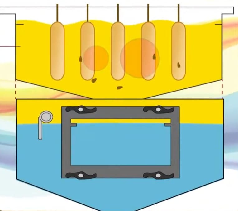 - Cơ chế lọc cặn tự động: Khi chiên, vụn thực phẩm, bột, hay cặn rơi ra có tỷ trọng nặng hơn dầu sẽ xuyên qua lớp dầu và rơi thẳng xuống tầng nước lạnh phía dưới. Tại đây, chúng không tiếp xúc với nguồn nhiệt cao nên không bị đốt cháy thành than đen.