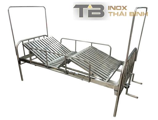 giường y tế inox 2 tay quay chức năng chính chủ yếu là nâng đầu và nâng chân người bệnh – giúp người bệnh cảm thấy thoải mái khi nằm vì máu huyết lưu thông về tim và đi khắp cơ thể nhẹ nhàng nhằm tránh tê bại do lâu ngày nằm 1 chổ không cử động phần chân và đầu. Góc nâng của phần đầu giường 1 góc từ 0º đến 83º và phần chân từ 0º đến 45º (phần đùi) và phần cẳng chân từ 0º lệch 1 góc 38º